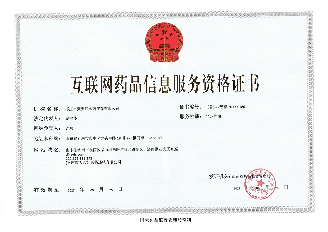 棗莊市天天好醫(yī)藥連鎖有限公司互聯(lián)網(wǎng)藥品信息服務資格證書